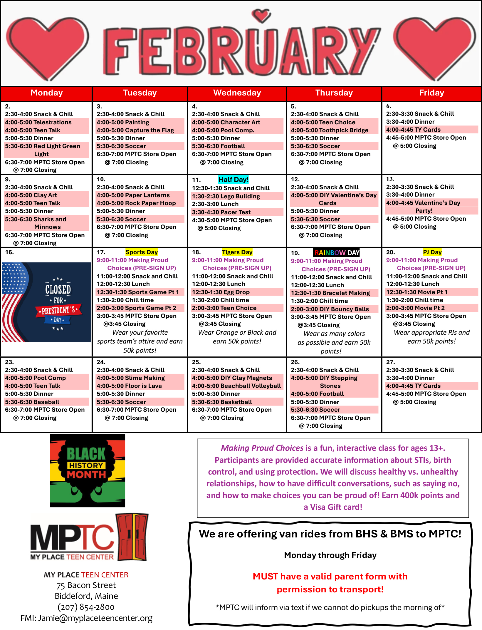 Check Out Our Monthly Calendars for Each Location Click on the calendar below to see a full schedule for the month. Westbrook Ages 10-18 FEBRUARY Biddeford Ages 10-18 FEBRUARY